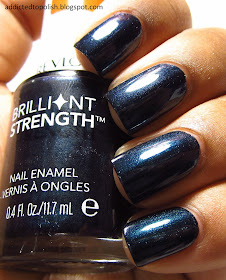 I first put on Revlon Beguile. Beguile is slightly duochrome. It's mostly a dark blue, but the shimmer in it flashes purple and teal depending on the light. (mostly teal) I have no complaints about the application. It went on pretty smooth and is nice and opaque.